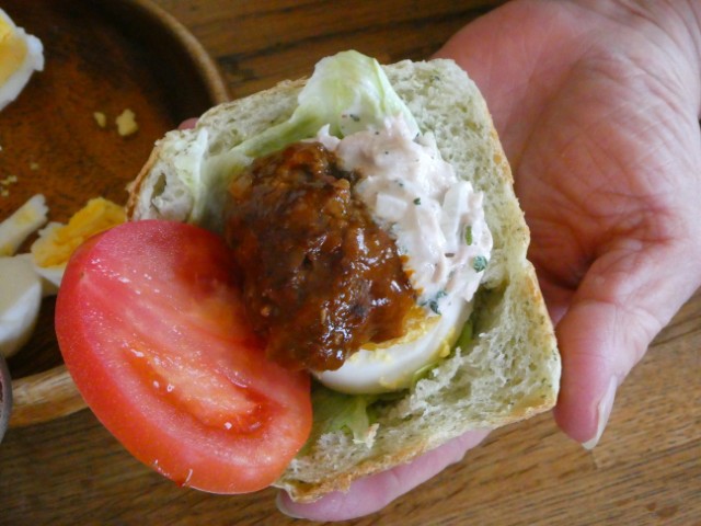 パンの中だけ食べてそこに卵とハンバーグとトマトとレタスを入れる。